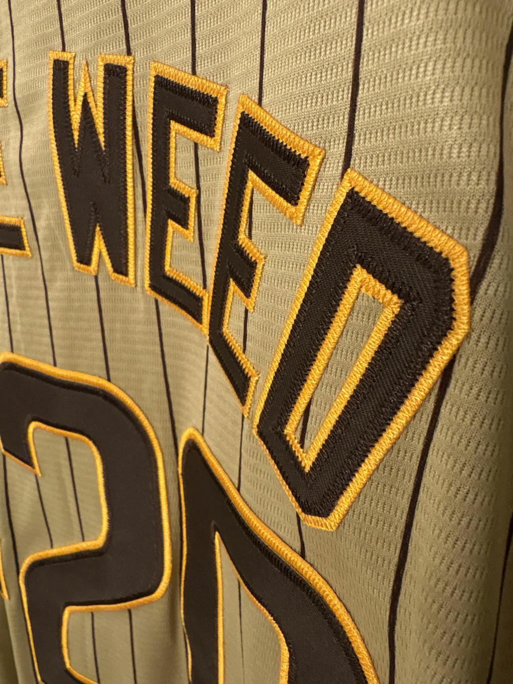 ♦ The name and number and team are all stitched.